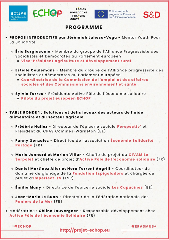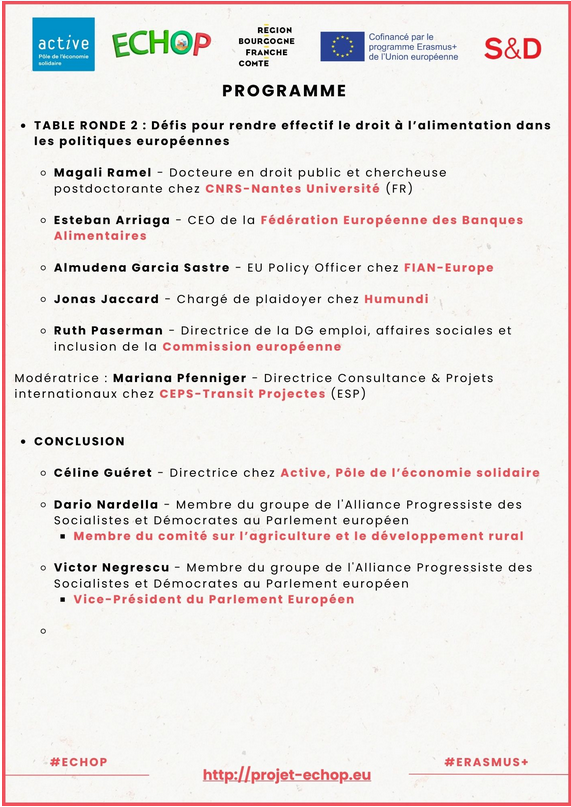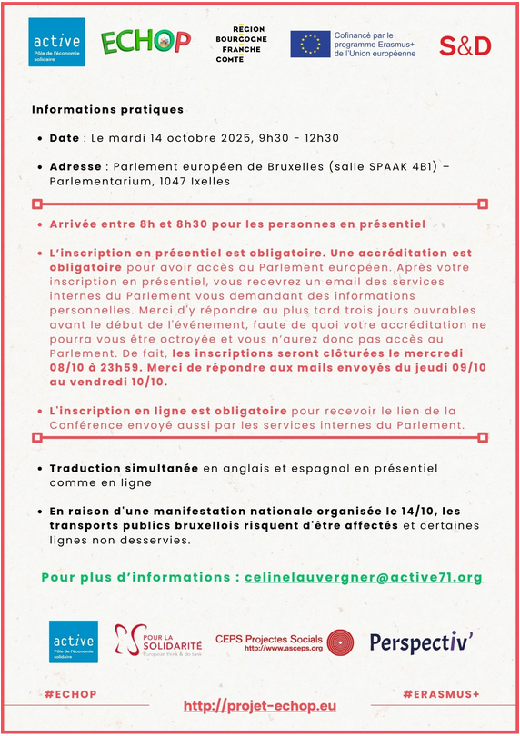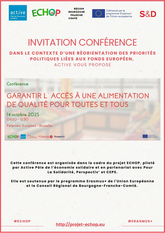 L'événement de clôture du projet ECHOP a eu lieu au Parlement européen de Bruxelles le mardi 14 octobre 2025, de 9h30 à 12h30, sous la forme d'une conférence sur les enjeux de l'accès à une alimentation de qualité pour tous dans le contexte d'une réorientation des fonds liées aux priorités des politiques européennes.